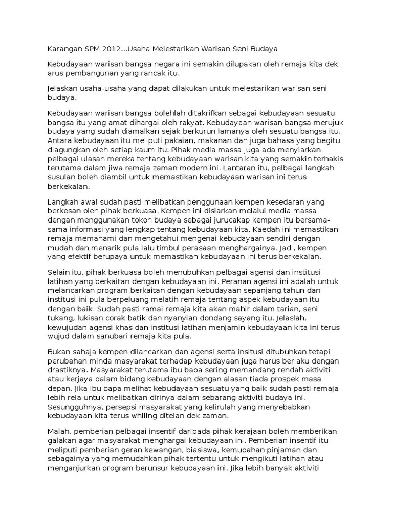 Kebudayaan warisan bangsa negara ini semakin dilupakan oleh remaja kita dek arus pembangunan yang rancak itu. Karangan lengkap usaha memperkenalkan dan mempopularkan seni dan budaya . Untuk memahami sesuatu masyarakat, kita perlu memahami bagaimana seni.